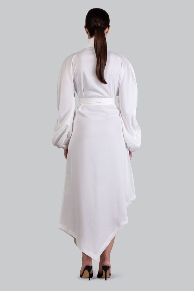 The Ray dress is made from soft satin fabric which drapes beautifully on the body. Designed with a wrap-around scarf and twisted balloon sleeves, it falls to dramatic asymmetric hem. cinch in your waist with the D-ring belt.
